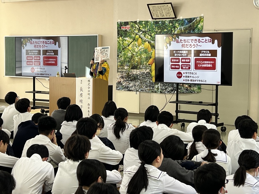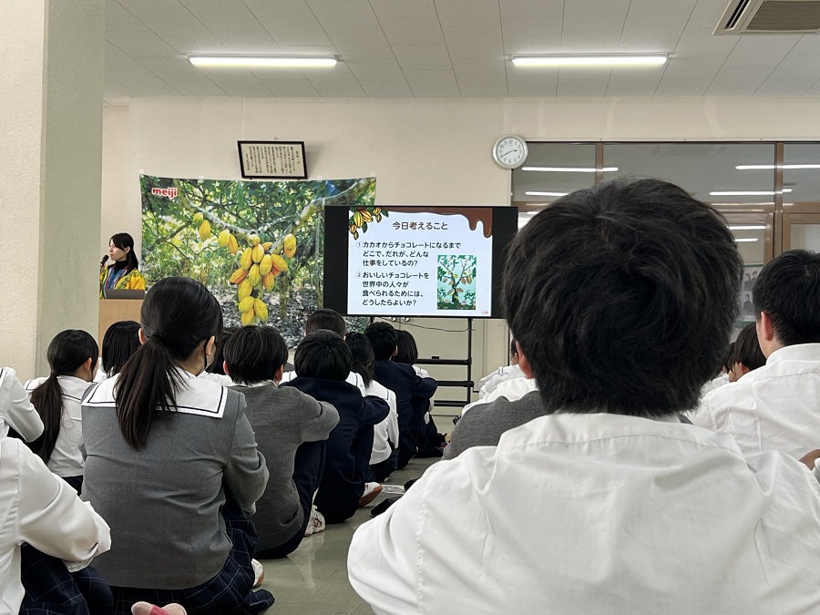 日常にあるチョコレートが、どのような土地で、どのような人々によって生み出されているのか──生徒たちは、話に聞き入りました。