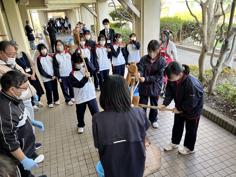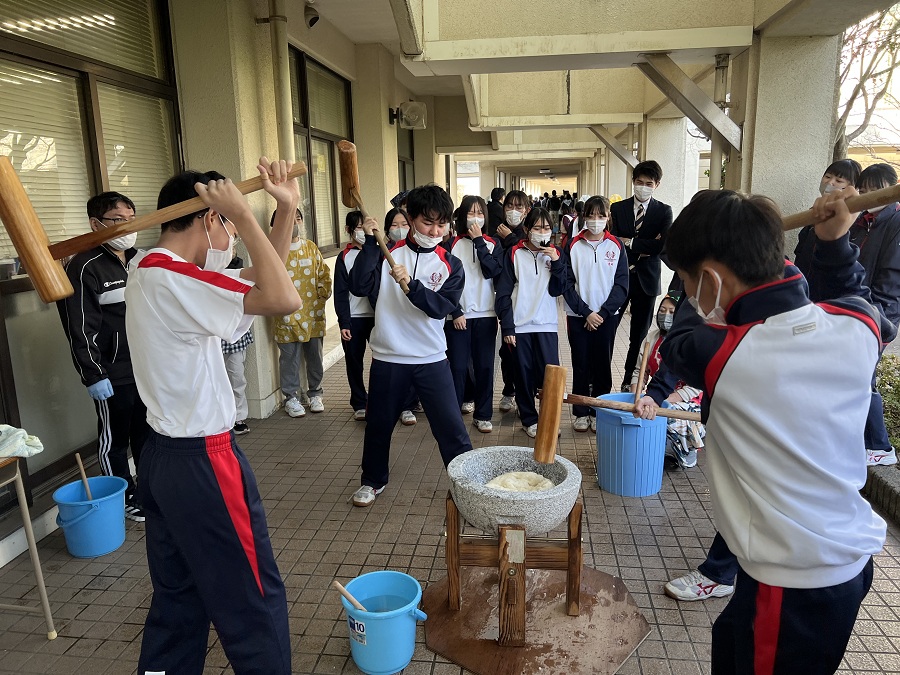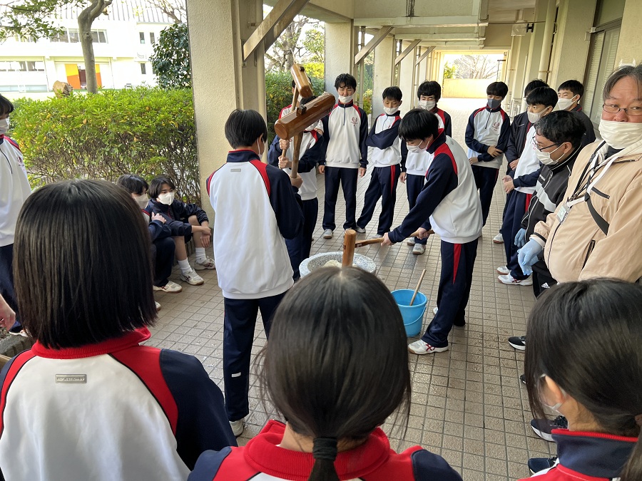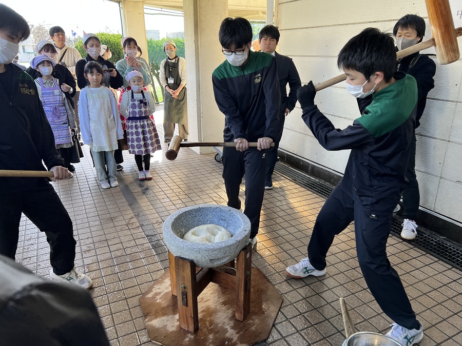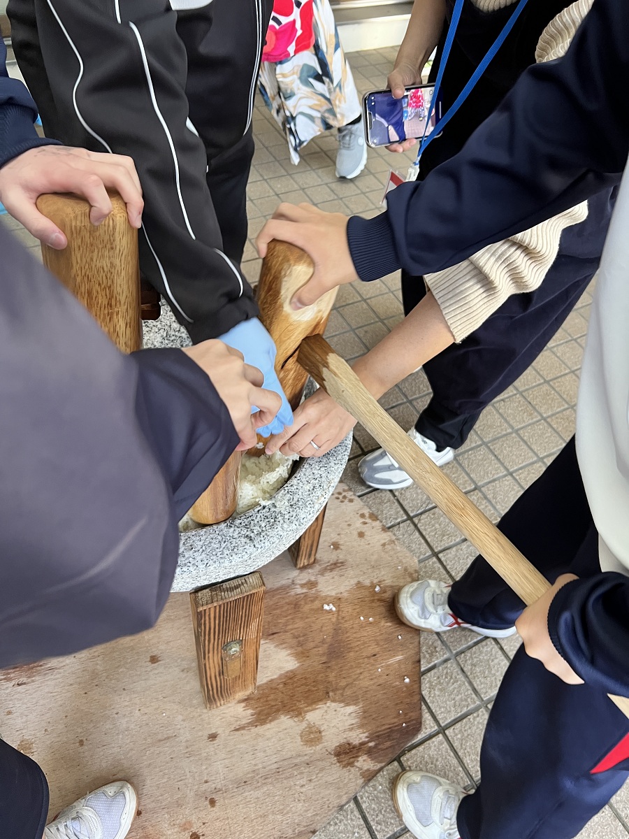 その後は、クラスごと、あるいは2クラス合同で、計6か所に分かれての餅つき。クラスメイト同士で声を掛け合い、自然と役割を分担しながら進める姿からは、協力し合う姿勢と一体感が感じられました。
